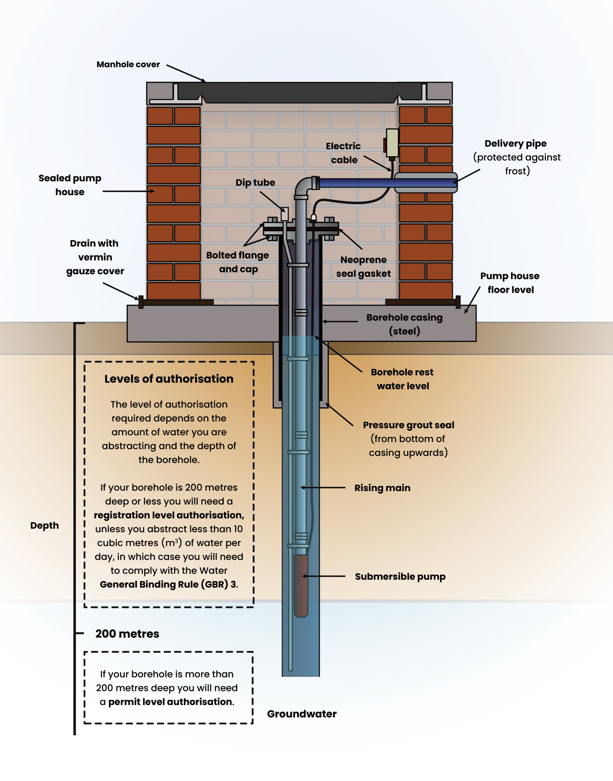 A borehole is a narrow hole made in the ground designed to locate materials such as water and oil. These systems can reach great depths and allow access to groundwater, which would not be otherwise available by other abstraction techniques. Boreholes are currently regulated by SEPA within their abstraction regulations, as shown in Figure 1.